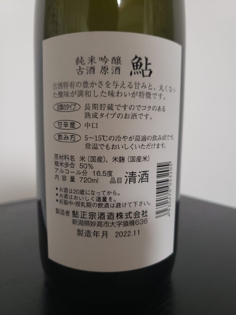 味は、スペック通り熟成と古酒の間というところです。熟成酒の丸みと甘み、重厚感がある一方で、古酒の仲間入りするようなひねた感じもそこそこあります。マニア向けかな、鮎正宗の初心者はフレッシュなお酒をお勧めします。